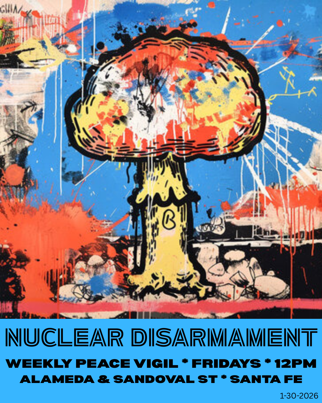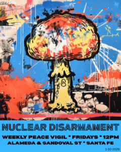 Join the nuclear disarmament community at the intersection of East Alameda and Sandoval in Santa Fe for the weekly peaceful protest in support of the Treaty on the Prohibition of Nuclear Weapons. Join with Veterans for Peace, CCNS, Nuclear Watch NM, Loretto Community, New Mexico Peace Fest, Pax Christi and others. Bring your flags, signs and banners.