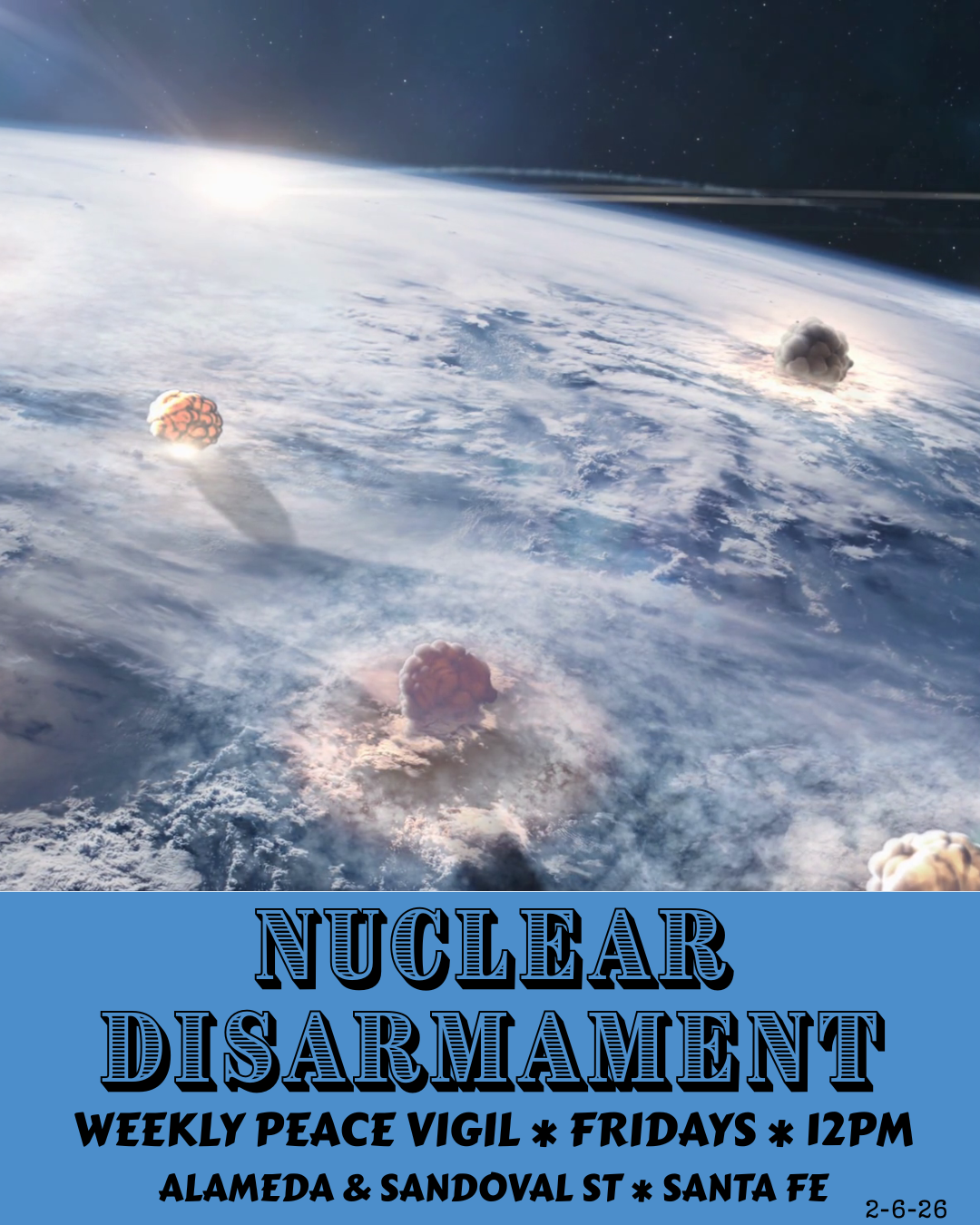 Join the nuclear disarmament community on the corners of East Alameda and Sandoval in Santa Fe from noon to 1 pm that day! Bring signs, banners, etc.