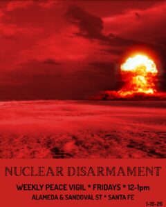 Join the nuclear disarmament community at the intersection of East Alameda and Sandoval in Santa Fe for the weekly peaceful protest in support of the Treaty on the Prohibition of Nuclear Weapons. Join with Veterans for Peace, CCNS, Nuclear Watch NM, Loretto Community, New Mexico Peace Fest, Pax Christi and others. Bring your flags, signs and banners.
