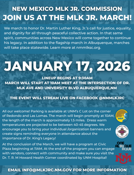 The New Mexico MLK Jr. Commission encourages your participation. “We march to honor Dr. Martin Luther King, Jr.’s call for justice, equality and dignity for all through peaceful collective action. In that same spirit, communities across New Mexico will come together to continue his legacy. In additional to the flagship march in Albuquerque, marches will take place statewide.” A schedule of commemorations is available at https://nmmlksc.org/2026-king-holiday-2/ The January 17th march will be live streamed on Facebook @NMMLKJRC. For more information, email info@mlkjrc.nm.gov