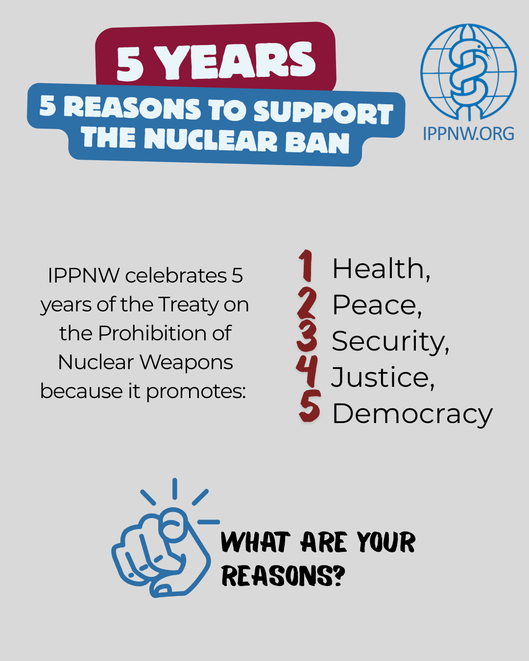 Five reasons could include health, peace, security, justice and democracy. A different five could be that the majority of the world supports the Treaty; the Treaty challenges deterrence; it reframes global security; nuclear weapons threaten everything we know and love; and emerging generations deserve a future without the threat and trauma of living with nuclear weapons.
