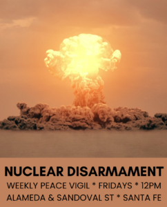 1. Friday, April 10th from noon to 1 pm – Join the nuclear disarmament community at the intersection of East Alameda and Sandoval in Santa Fe for the weekly peaceful protest in support of the Treaty on the Prohibition of Nuclear Weapons. Join with Veterans for Peace, CCNS, Nuclear Watch NM, Loretto Community, New Mexico Peace Fest, Pax Christi and others. Bring your flags, signs and banners.